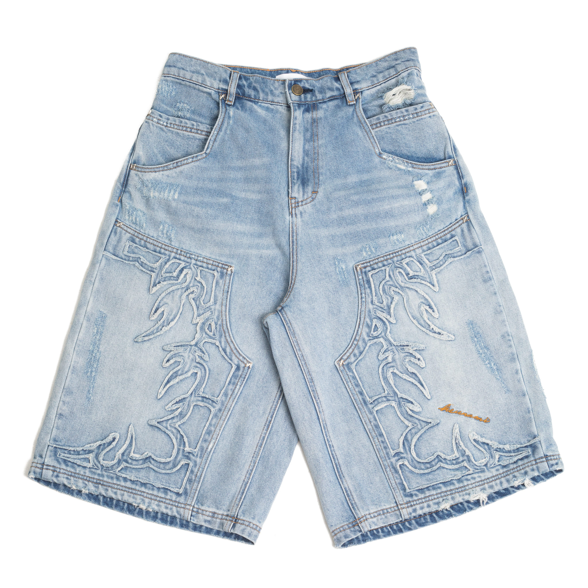 Oversized 7.5-Length Cut (3/4) 寬鬆7.5分精確剪裁 Laser-Ablated 3D Embroidery 雷射雕蝕立體刺繡Fringed Texture With Hand-Distressed Detailing 抽鬚紋理與手工破壞處理 Signature Seagull-Inspired Paneling Throughout Construction 品牌標誌性海鷗線條貫穿構造拼接 Custom HSUNAMÏ Logo-Engraved Hardware 品牌刻印專屬五金 Enzyme Stone Wash / Vintage Yellow Tint Finish酵素石洗與仿舊黃染工藝